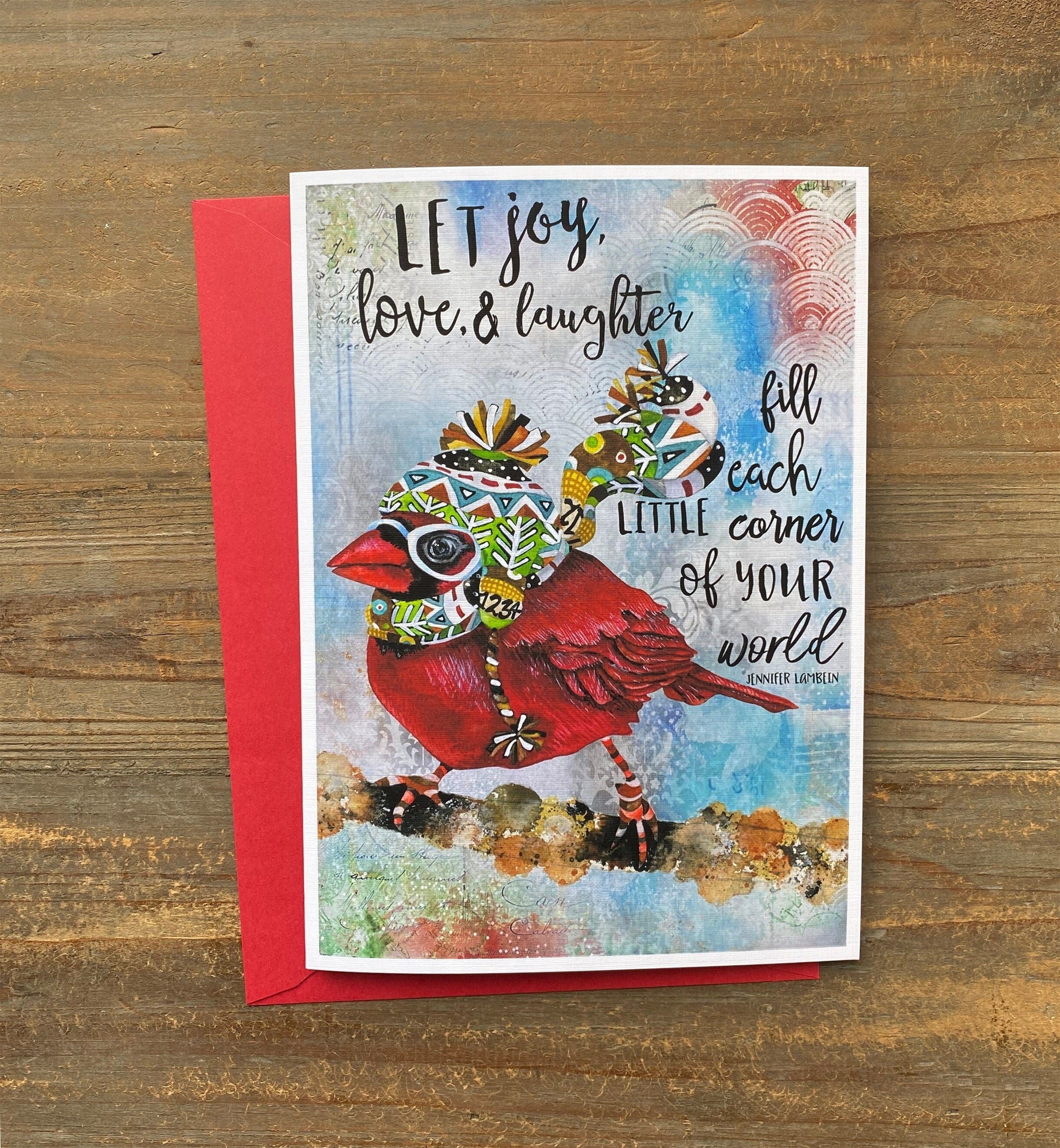 Bring true joy, love & laughter to friends and family this holiday season, with this gorgeous festive Christmas cardinal greeting card.