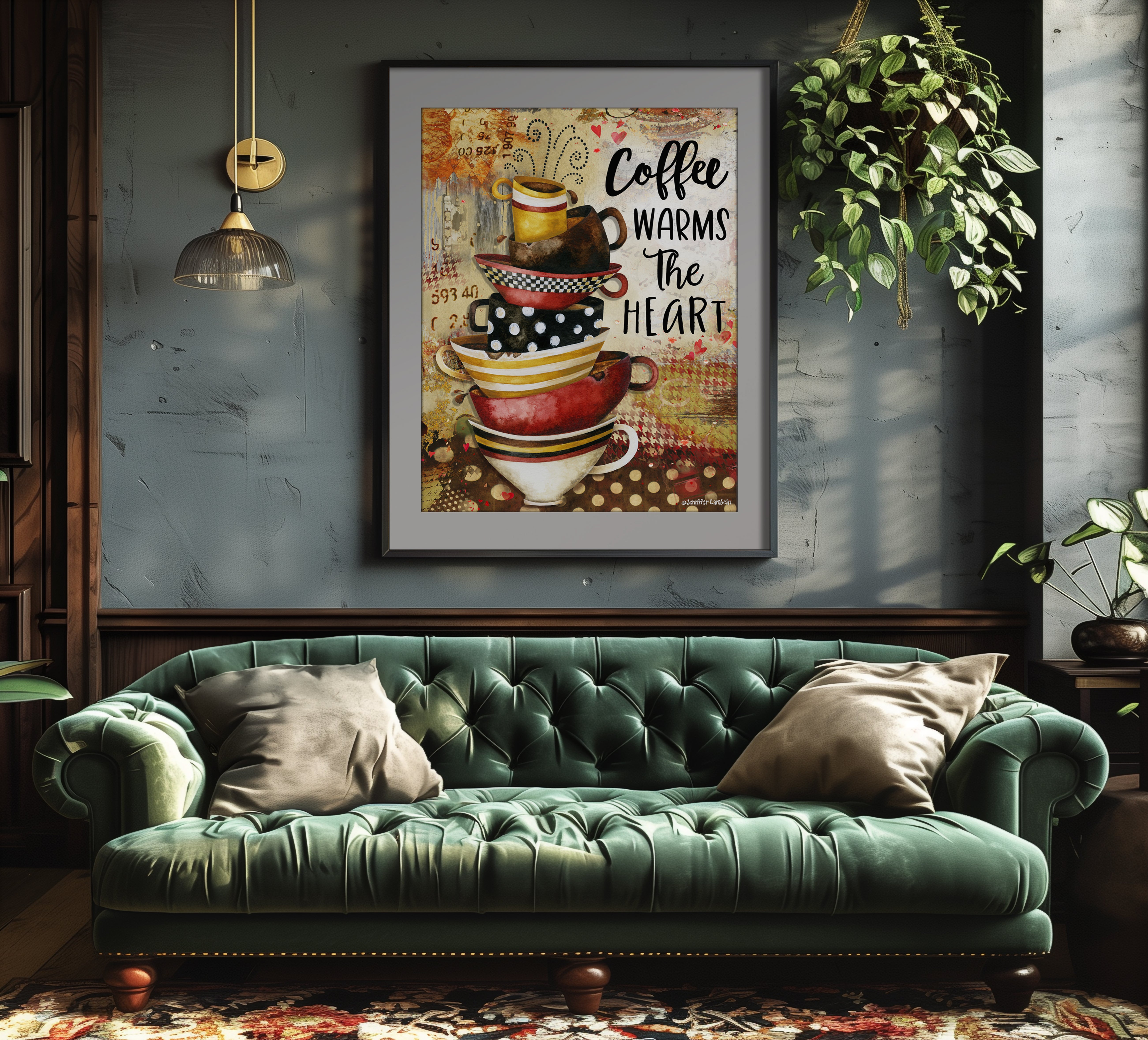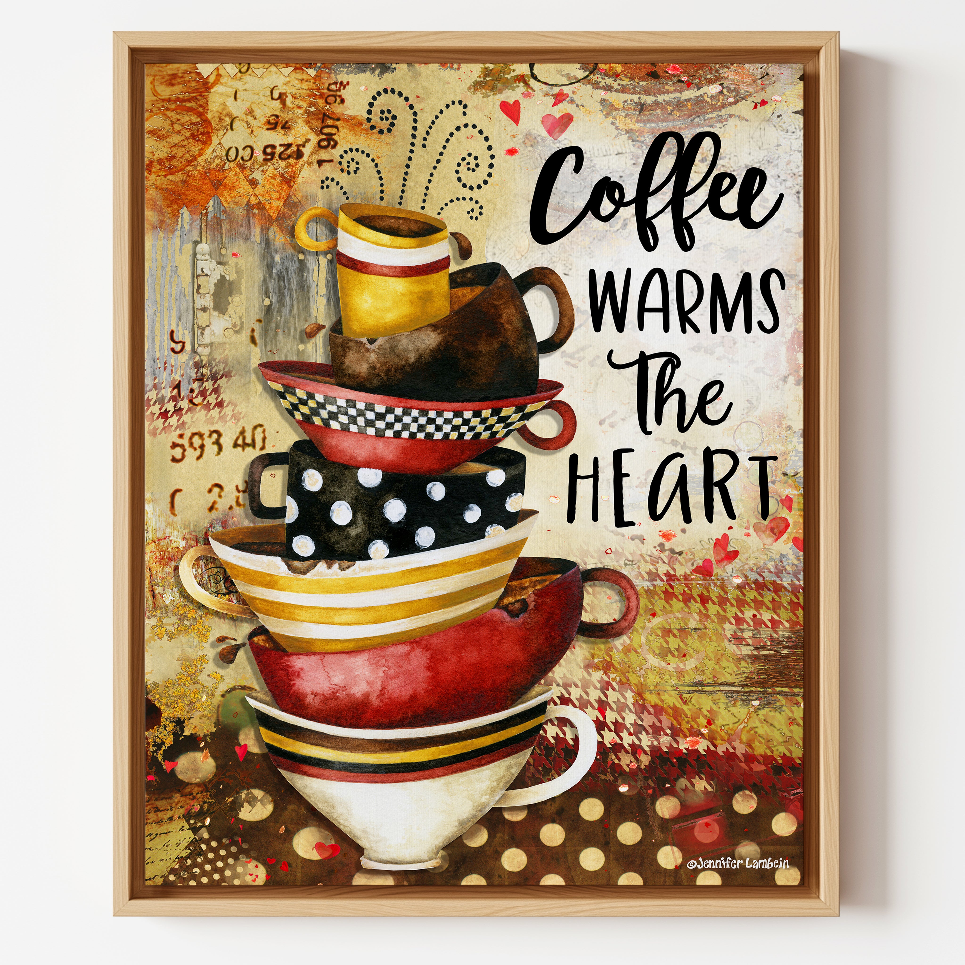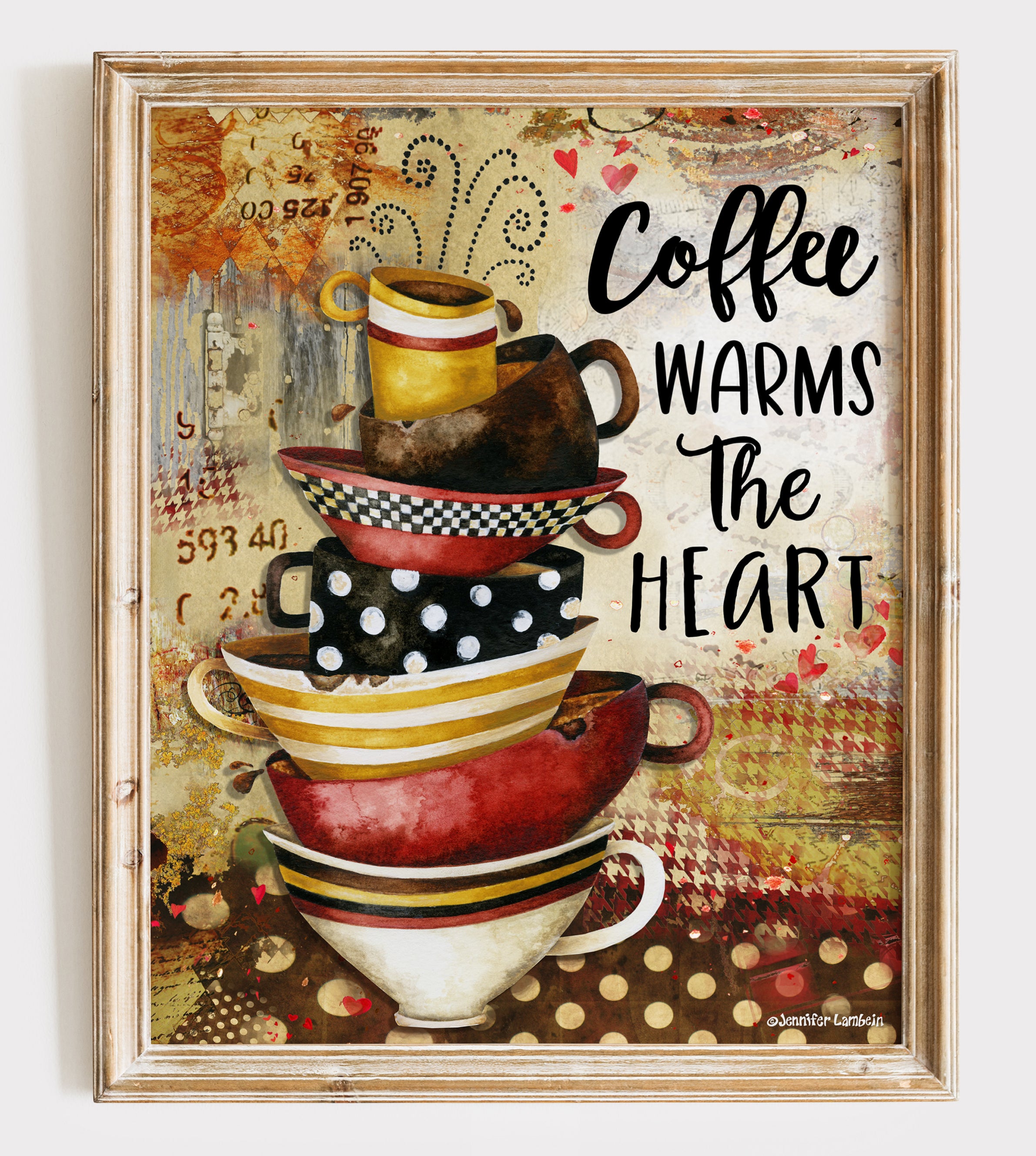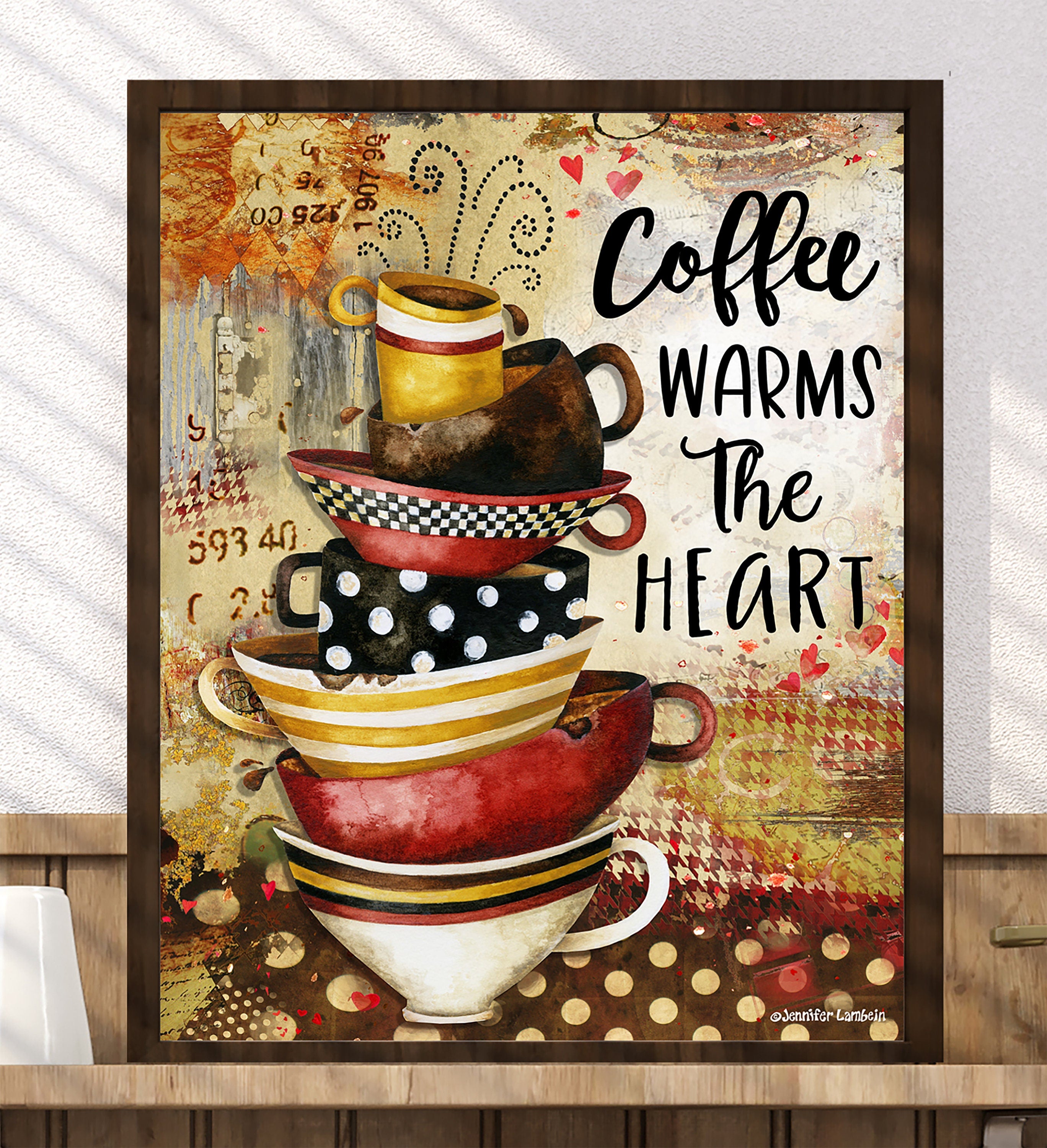 The retro style coffee cup art is printed on acid free paper with an elegant linen texture. Its subtle linen finish enhances the artistic aspects of the work.