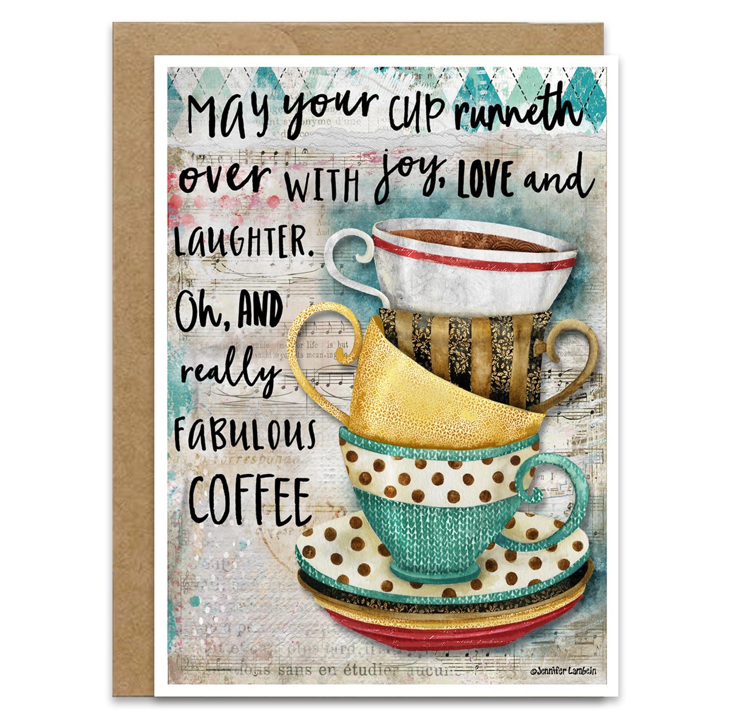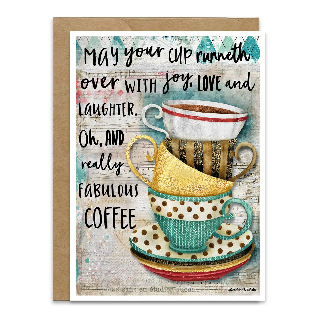Remind that special friend or family member you truly wish them joy, love & laughter...And, of course...really fabulous coffee! This unique card has a beautiful mixed media painting by artist Jennifer Lambein.